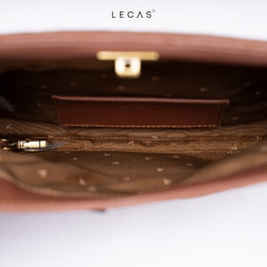 • Interior: One large zippered compartment with a small inner pocket. Additionally, when the flap (which also serves as the bag opening) is opened, there is a zippered front pocket.